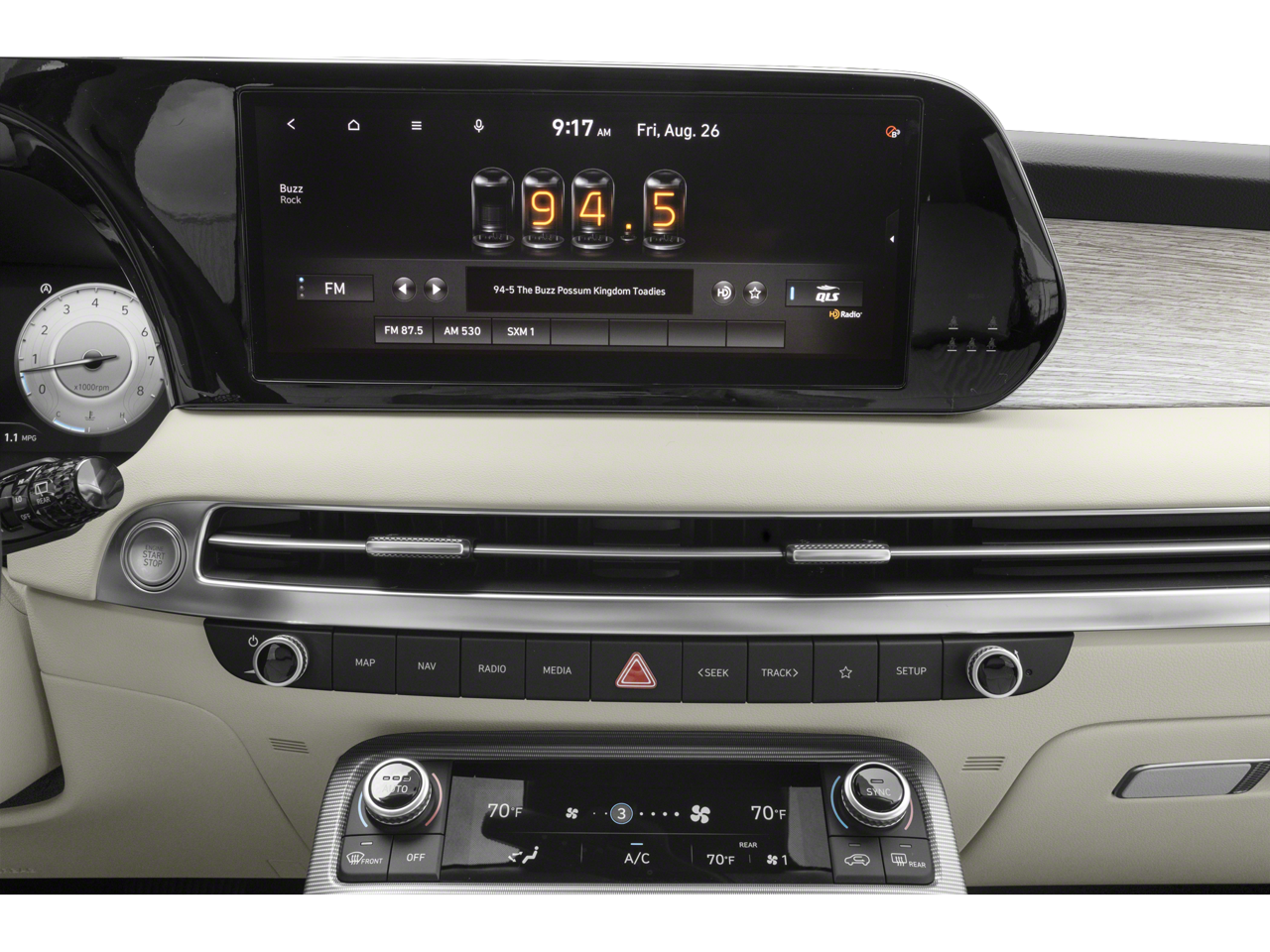 - Radio: AM/FM/MP3 Premium Audio System -inc: 630-Watts, Harman Kardon audio system w/12-speakers, Quantum Logic Surround, Clari-Fi, 12.3" color touchscreen display, onboard navigation w/traffic flow including incident data via HD Radio (HERE), Over-the-Air (OTA) map updates, SiriusXM, Android Auto and Apple CarPlay, USB, dynamic voice recognition, rear seat quiet mode, passenger talk (in-car intercom), Bluetooth® hands-free connectivity w/multiple device connection and Bluelink Connected Car System
